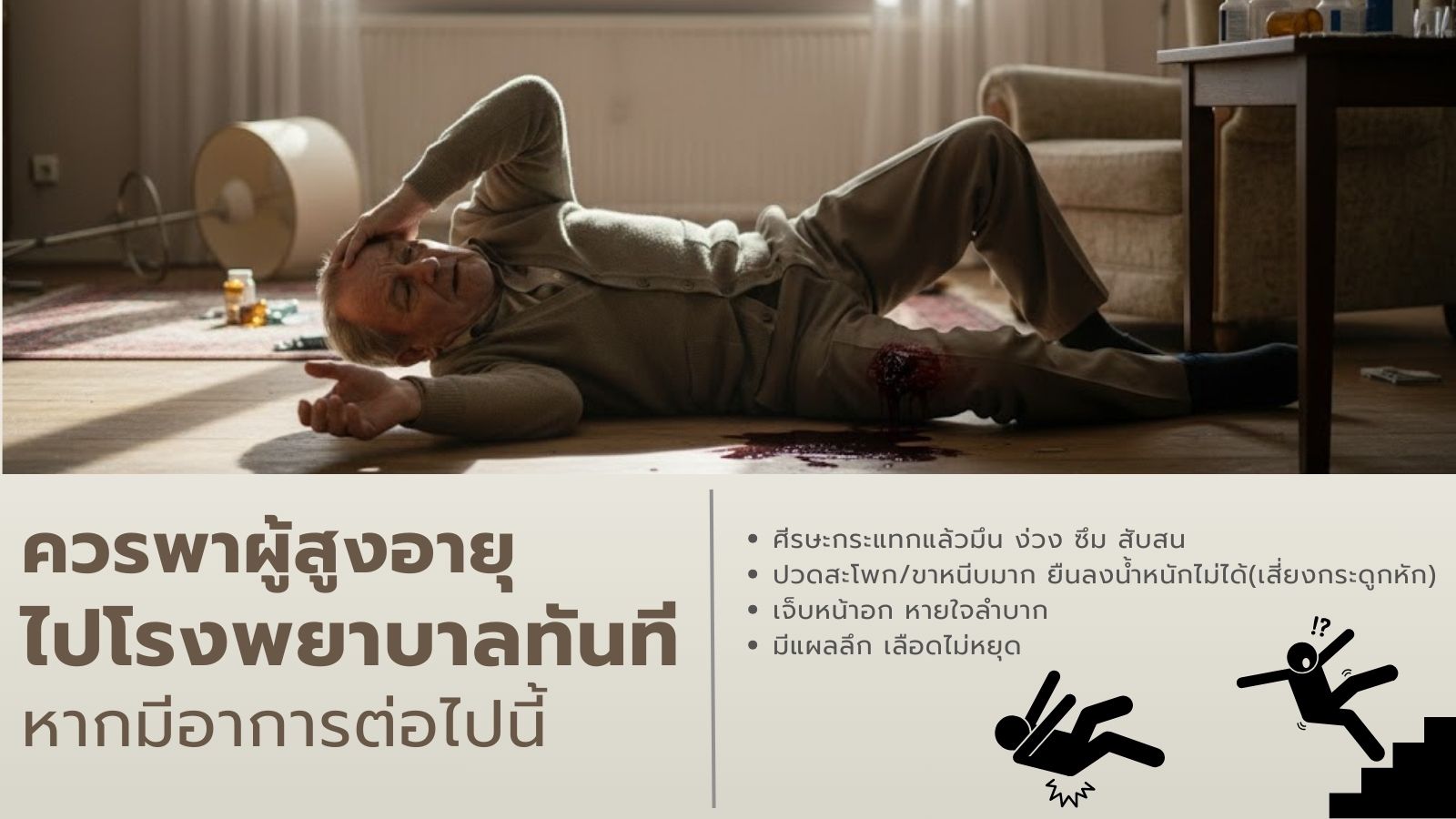 องค์การอนามัยโลก (WHO) ระบุว่า ผู้สูงอายุเป็นกลุ่มที่มีความเสี่ยงต่อการบาดเจ็บรุนแรงจากการหกล้มสูง โดยประมาณ 20–30% ของผู้สูงอายุที่หกล้มจะมีอาการบาดเจ็บระดับปานกลางถึงรุนแรง เช่น กระดูกสะโพกหัก กระดูกสันหลังหัก หรือศีรษะกระแทก ซึ่งอาจนำไปสู่ความพิการ การพึ่งพาผู้อื่น หรือแม้กระทั่งการเสียชีวิตได้ ดังนั้น การทำความเข้าใจสาเหตุของการหกล้มจึงเป็นก้าวแรกที่สำคัญในการป้องกัน