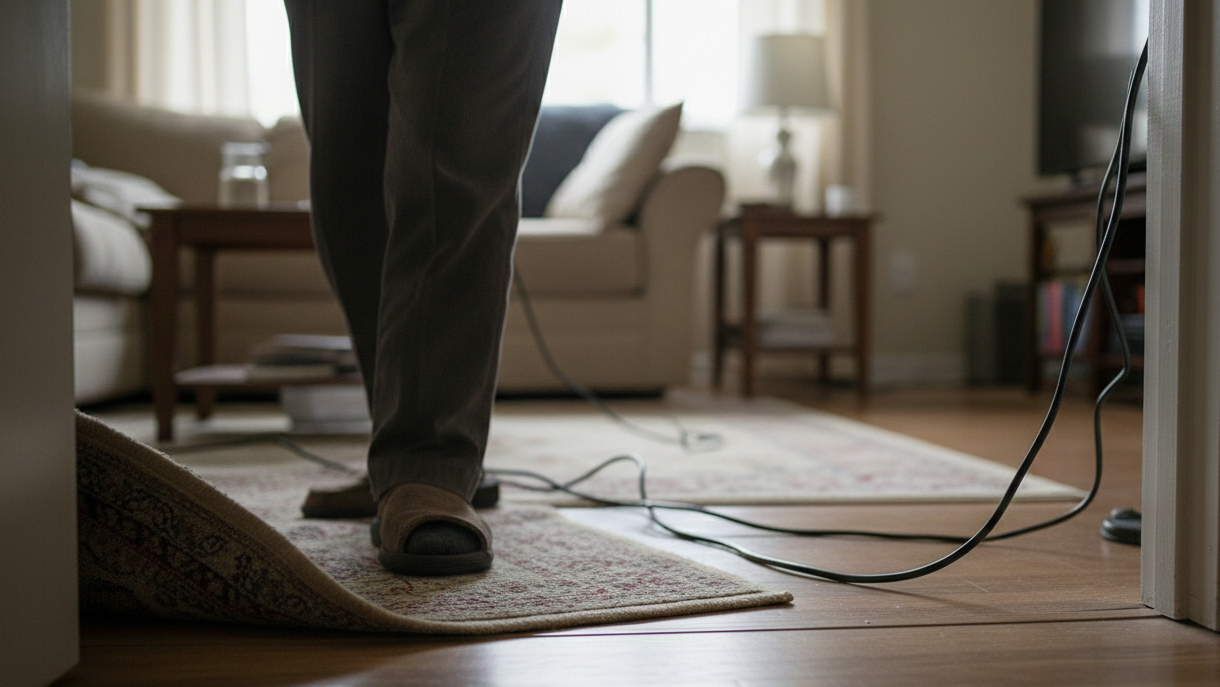 จุดเสี่ยงที่พบบ่อย : บันไดไม่มีราว | ของวางกีดขวาง | พรม/สายไฟหลวม